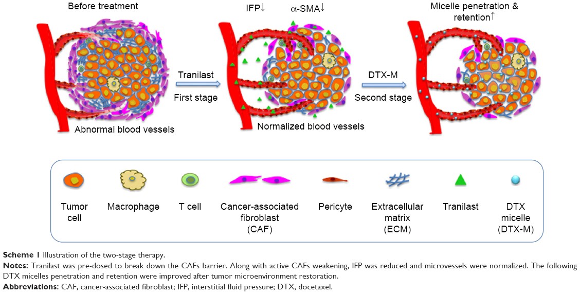 Results:Diverse experiments demonstrated that tranilast enhanced DTX-Ms’antitumor effect in a two-stage pattern by CAFs ablation, tumor cell migration blocking, and metastasis inhibition. Along with activated CAFs decreasing in vivo, the two-stage therapy succeeded in reducing interstitial fluid pressure, normalizing microvessels, improving micelles penetration and retention, and inhibiting tumor growth and metastasis. Interestingly, tranilast alone failed to inhibit tumor growth in vivo, and it could only be used as an adjuvant medicine together with an antitumor agent.