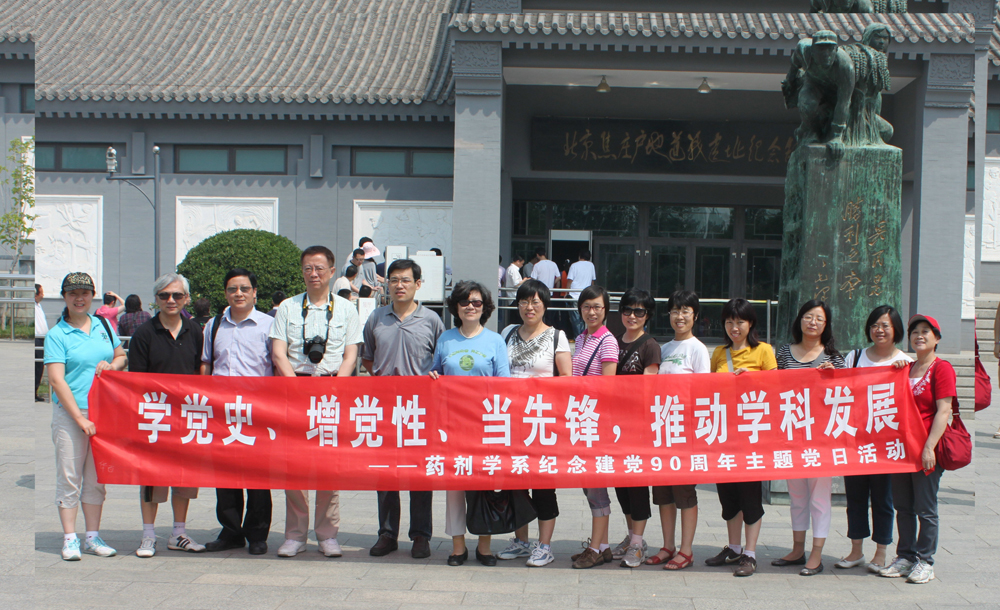 2011年是中国共产党建党90周年,为缅怀革命先烈的英雄业绩, 激励党员同志的先锋带头作用,加强系教工的传统爱国教育,2011年6月9日,药剂学系党支部和工会小组联合组织了以“学党史,增党性,当先锋,推动学科发展”的主题党日活动,全体教师参观了焦庄户地道战遗址,游览了汉石桥湿地公园。